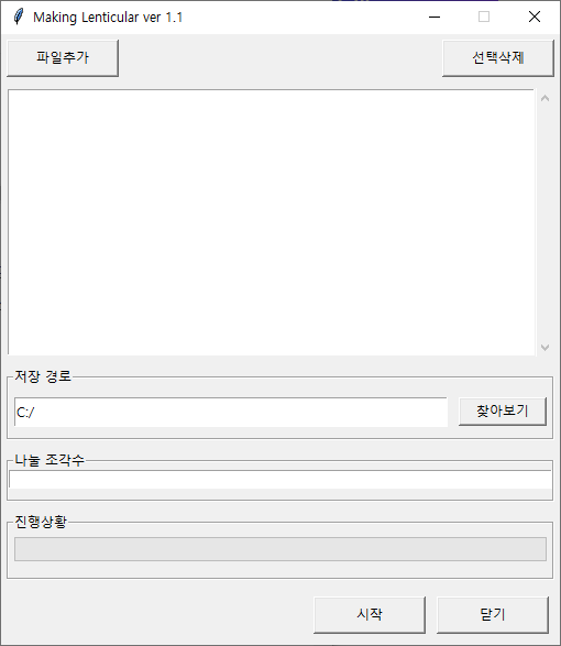 코드를 실행하면 위와 같은 gui가 나타나며, 촬영된 사진 두 장(해상도가 같은)을 프로그램을 통해 렌티큘러 이미지를 생성합니다. 프로그램은 파일 선택/삭제 및 저장 경로 프레임을 구성하였고, 다양한 렌티큘러 렌즈의 사이즈에 맞추어 이미지를 편집할 수 있도록 이미지 분할 사이즈(나눌 조각수)를 조절할 수 있도록 하였습니다. 이때 조각수는 이미지의 해상도(가로)보다 작게하되, 사용될 렌티큘러 렌즈의 피치에 맞게 계산하여 기입해야 합니다.
