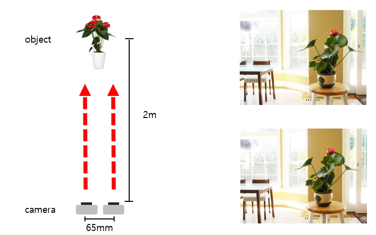 촬영 방법은 그림과 같이 물체를 양안 시차의 간격인 6.5cm의 간격으로 두 번 촬영하였습니다.(사실 이 부분은 여러 렌티큘러 제작 방법에 관한 사이트에서 설명하는 방법이나, 실제로는 카메라와 물체와의 거리에 따라 두 이미지 간의 차이가 크게 생기기 때문에 이 부분도 대략적인 눈대중으로 실시하였습니다.) 이때 주의할 점은 양안 시차의 간격보다 큰 간격으로 촬영할 경우 렌티큘러 이미지를 만들었을 때 뒤틀림이 심하고 양안 시차의 효과를 보기 어렵습니다. 촬영 거리의 경우 육안으로 보았을 때 물체를 식별할 수 있을 정도의 거리가 적절하며, 명확한 결과물을 얻기 위해 2m 거리에서 촬영된 샘플 이미지를 사용하였습니다.