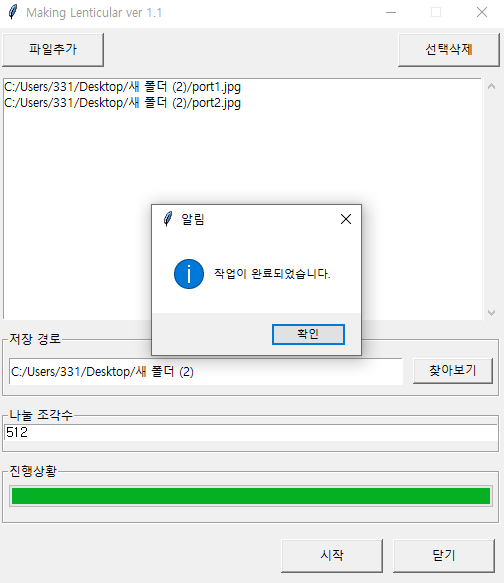 작업이 완료되면 알림창과 함께 저장 경로 위치에 파일이 생성된다.