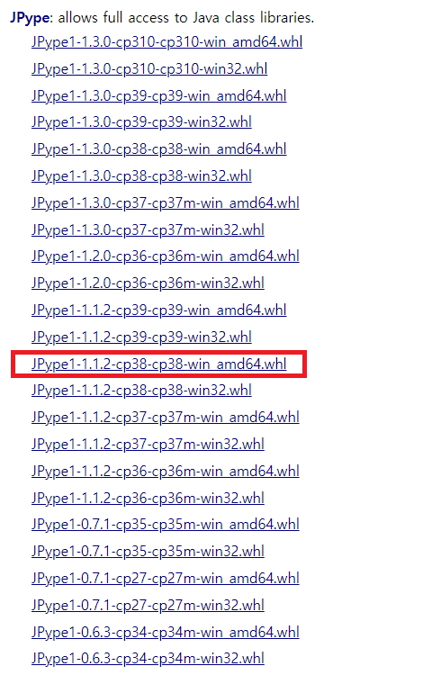 JPype 항목을 찾고, 저의 경우 윈도우 환경의 python 3.8 버전을 사용하므로 빨간 박스된 파일을 다운 받았습니다.