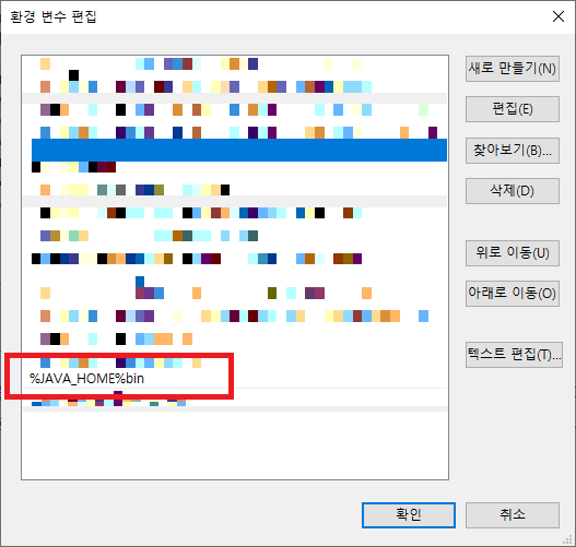 새로 만들기를 클릭하여 %JAVA_HOME%bin 을 입력하고 확인을 누르면 java JDK에 대한 설치는 완료가 됩니다.