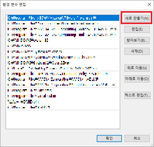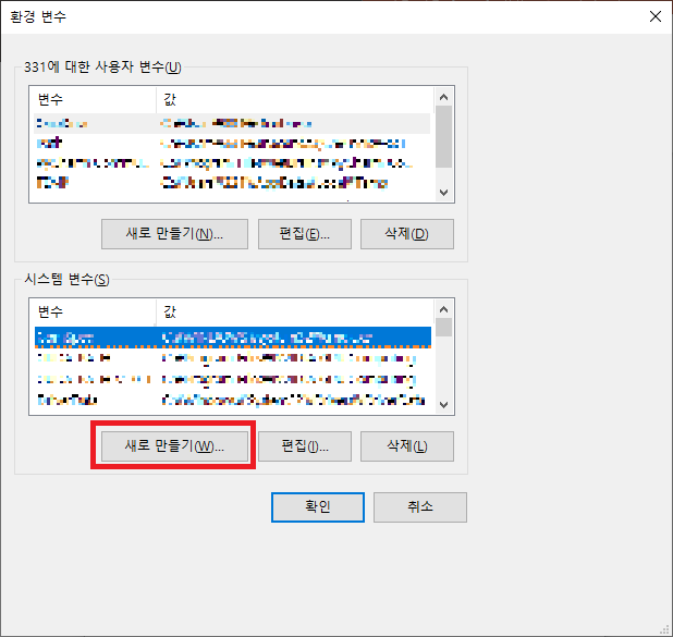 환경변수를 눌러 밑의 시스템 변수를 새로 만듭니다. 변수 이름과 변수 값을 입력하는데 변수 이름은 JAVA_HOME 으로, 변수 값은 java JDK가 설치된 경로를 입력하면 됩니다.