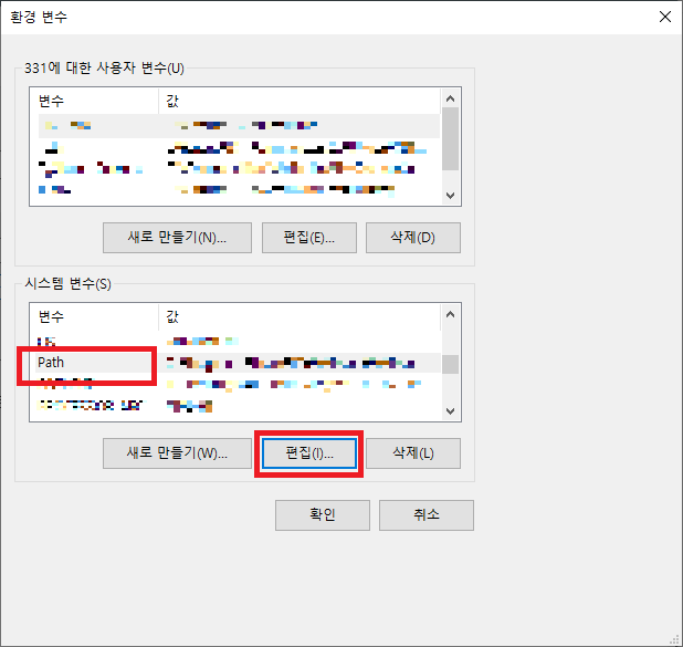 다음으로 시스템 변수의 path 변수를 클릭해 편집을 누릅니다.
