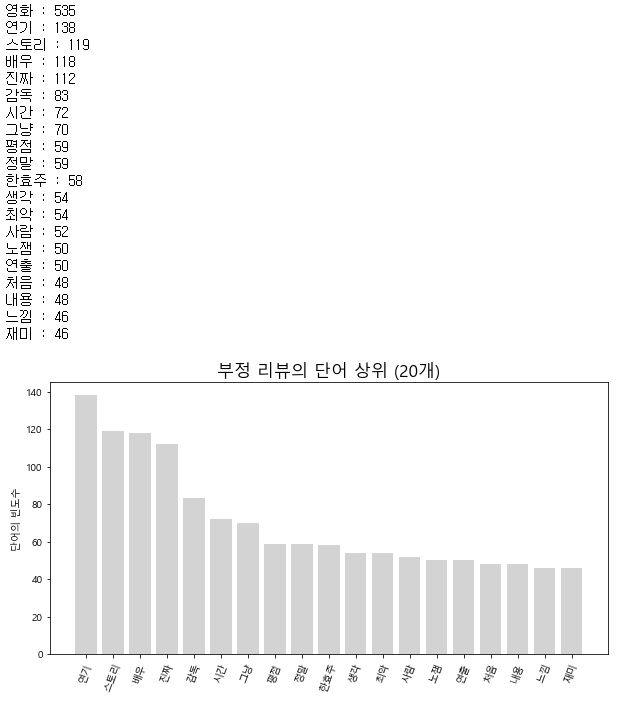 긍정 리뷰와 똑같은 방식으로 부정 리뷰에 대한 단어 빈도수 분석도 실시합니다.