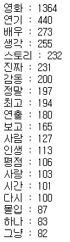 영화 리뷰 데이터 분석의 마지막 단계로 리뷰에서 단어들만을 추출한 뒤, 빈도 분석과 wordcloud를 활용한 시각화를 진행해봅니다.
