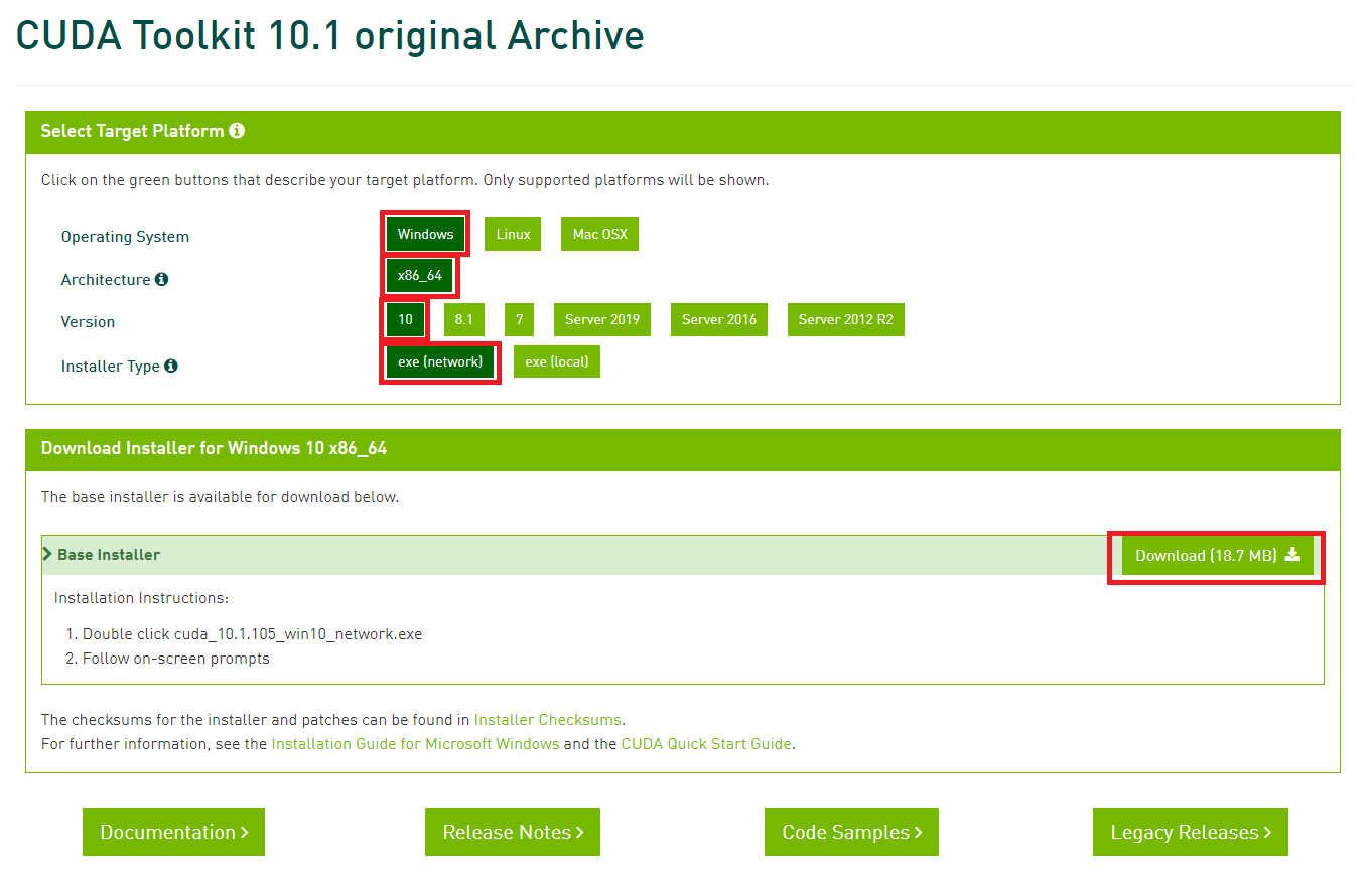 제가 다운로드한 GPU 드라이버의 경우 511.79 이므로 가장 최신 버전의 CUDA와 호환되지만, 후술할 tensorflow와의 호환성을 고려하여 빨간 박스가 된 10.1 버전을 다운로드 하였습니다. (다른 여러 블로그의 포스팅을 참조한 결과, 저의 GPU인 2080Ti는 대체적으로 10.1 버전이 잘 맞는다는 의견이 있어 이 또한 참고하였습니다.)