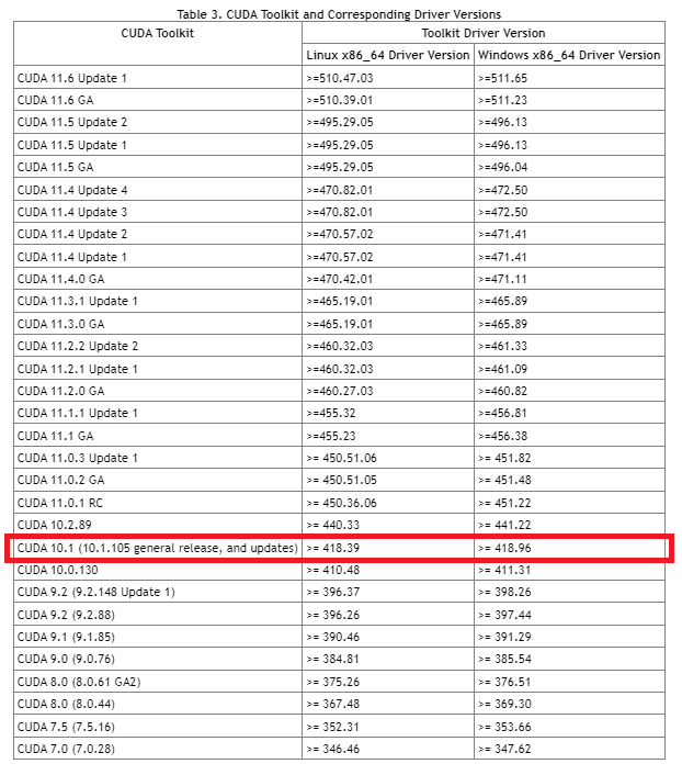 CUDA toolkit 사이트에 따르면 위 표와 같이 다운받은 GPU 드라이버 버전과 다운로드 할 CUDA와의 버전 호환성을 제시합니다. 다운로드 한 드라이버의 버전을 참고하여 이와 호환되는 CUDA를 다운로드하면 되겠습니다.