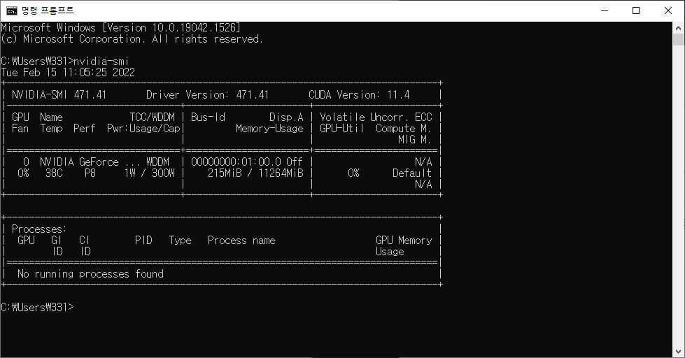 정상적인 설치가 되었을 경우 설치된 그래픽카드 드라이버의 버전이 출력됩니다. 오른쪽의 CUDA Version은 무시하셔도 됩니다.