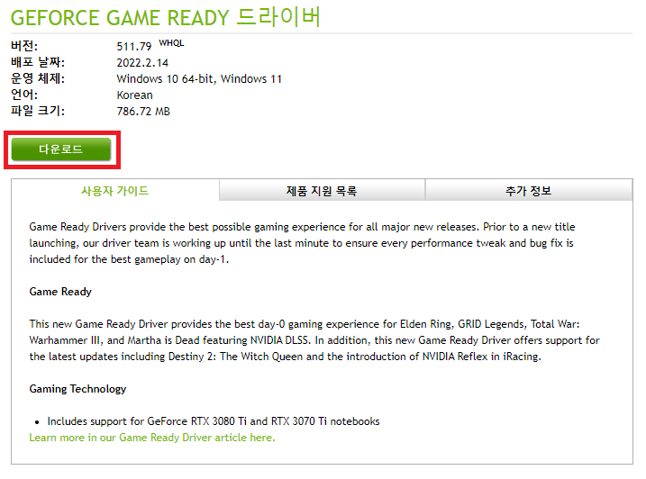 그래픽 카드 확인이 완료되면 링크를 통해 해당 제품에 맞는 드라이버를 다운로드합니다.