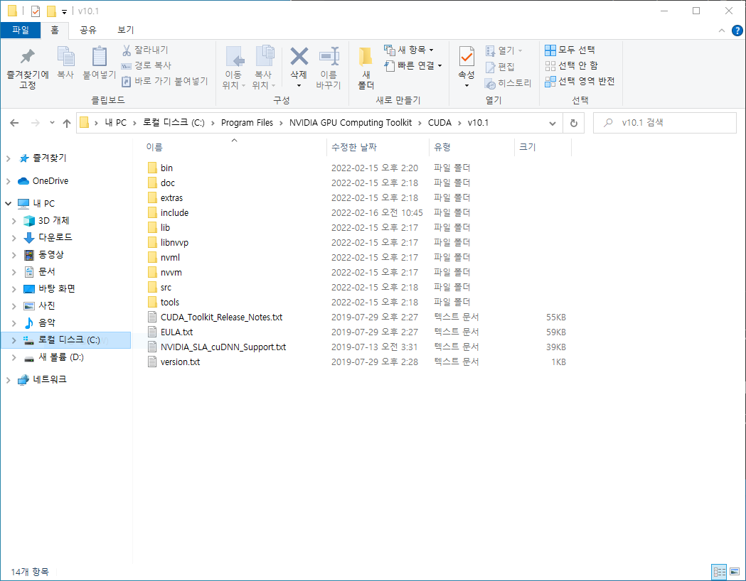 링크를 통해 접속하면 위와 같은 화면을 볼 수 있는데(로그인 필요) 설치한 CUDA 버전과 OS에 맞게 다운로드 합니다. 다운로드 후 zip 파일을 열어 CUDA가 설치된 경로(저의 경우 C:\Program Files\NVIDIA GPU Computing Toolkit\CUDA\v10.1) 에 그대로 덮어씌우면 됩니다. (같은 이름 파일 덮어 씌우기에 대해 모두 예)