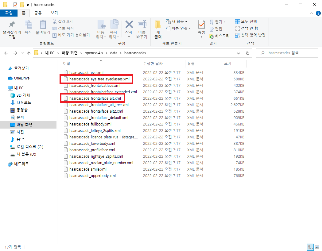 해당 ZIP 파일을 압축해제 한 뒤 data -> haarcascades 폴더에 이번 예제에 필요한 haarcascade_frontalface_alt.xml 과 haarcascade_eye_tree_eyeglasses.xml 파일이 있습니다.