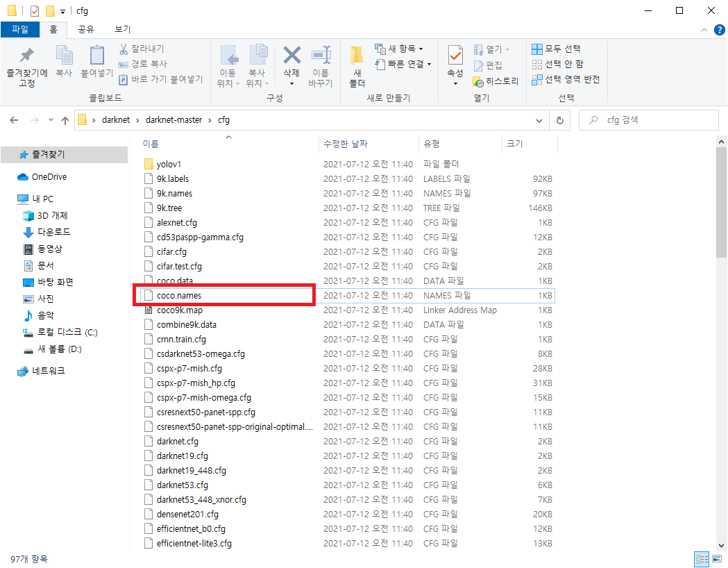 이전 다운로드 하였던 darknet 폴더에서 darknet-master -> cfg 의 경로 속에 coco.names를 편집기 등을 통해 확인합니다. 여러가지를 활용해 볼 수 있겠지만 저의 경우 간단하게 VScode로 확인하였습니다.