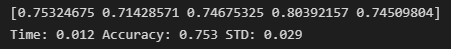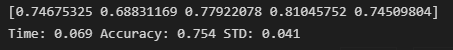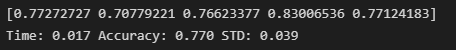 print("Time: %.3f" % (end-start), "Accuracy: %.3f%%" % (result.mean()*100), "STD: %.3f%%" % (result.std()*100))